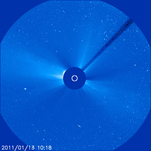 Trad. approx.: 13 janvier 2011 - Une région active sur la face cachée du soleil a explosé ce matin, lançant une brillante CME [Éjection de Masse Coronale] dans l'espace. [...] Le satellite STEREO-B de la NASA est stationné presque directement au-dessus du lieu de l'explosion. Le téléscope spatial d'extrême UV a capté l'explosion depuis son début ; ce film montre l'éruption et l'ombre de l'onde de choc qu'elle a propulsée à travers l'atmosphère du soleil.