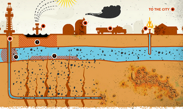 Non seulement on y extrait du pétrole et du gaz naturel, mais de l’eau chimiquée est injectée dans les strates rocheuses pour libérer plus de pétrole et de gaz naturel par un procédé appelé fracturation (« fracking ») :