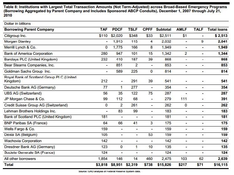 Vous trouverez ci-dessous la liste des bénéficiaires des largesses de la Réserve Fédérale..retenons juste les principaux, les autres sont du menus fretin, vous le constaterez en comparant les chiffres :